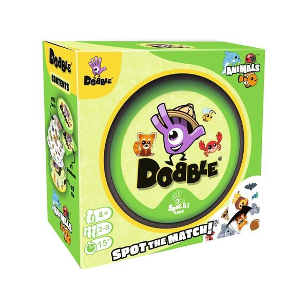 A clever game with 55 cards, 57 symbols in total, and 8 symbols per card. Each two cards have one animal symbol in common, that you have to find and name to win! In total, discover 5 mini games and challenges to play together. Dobble Animals is a game that encourages concentration and observation.
